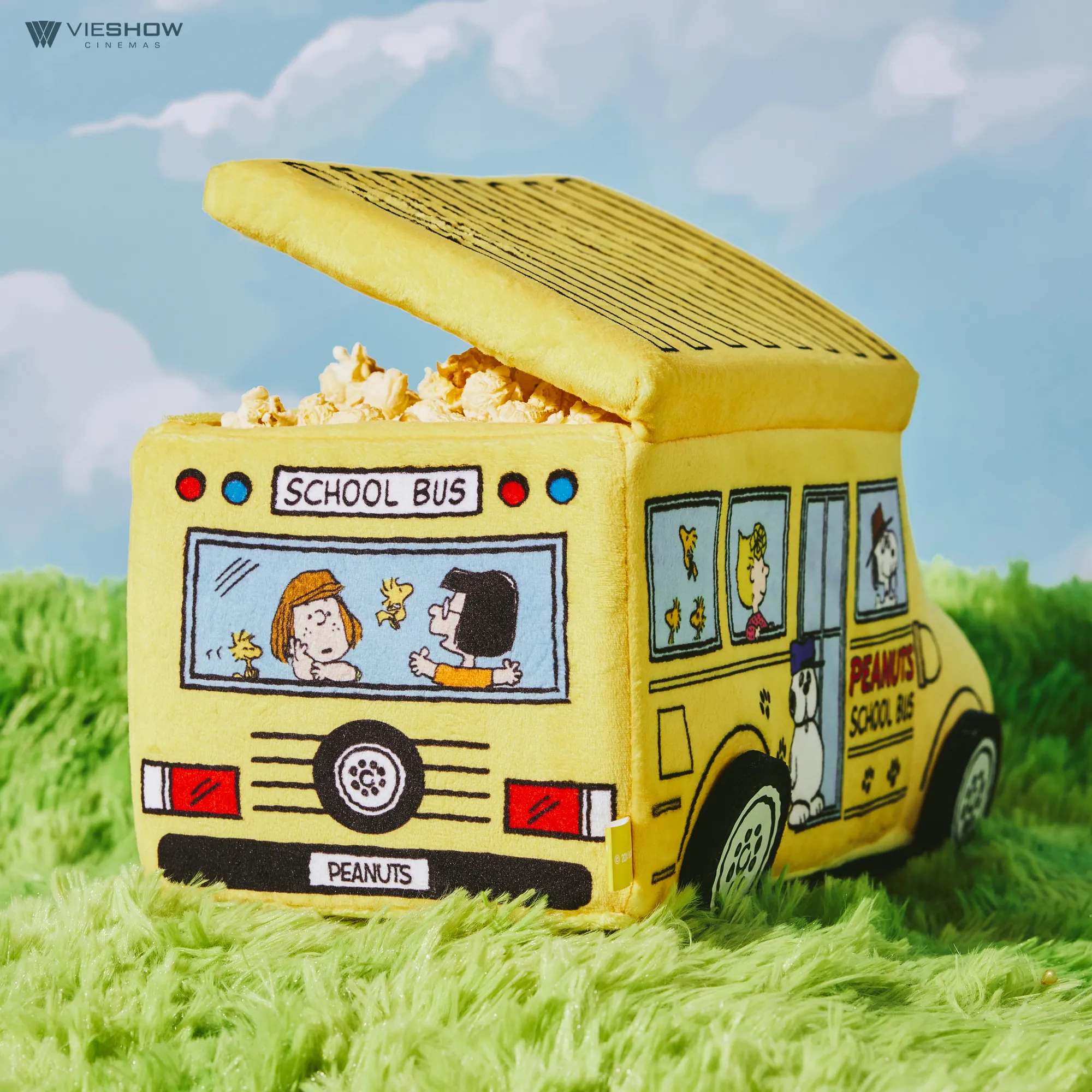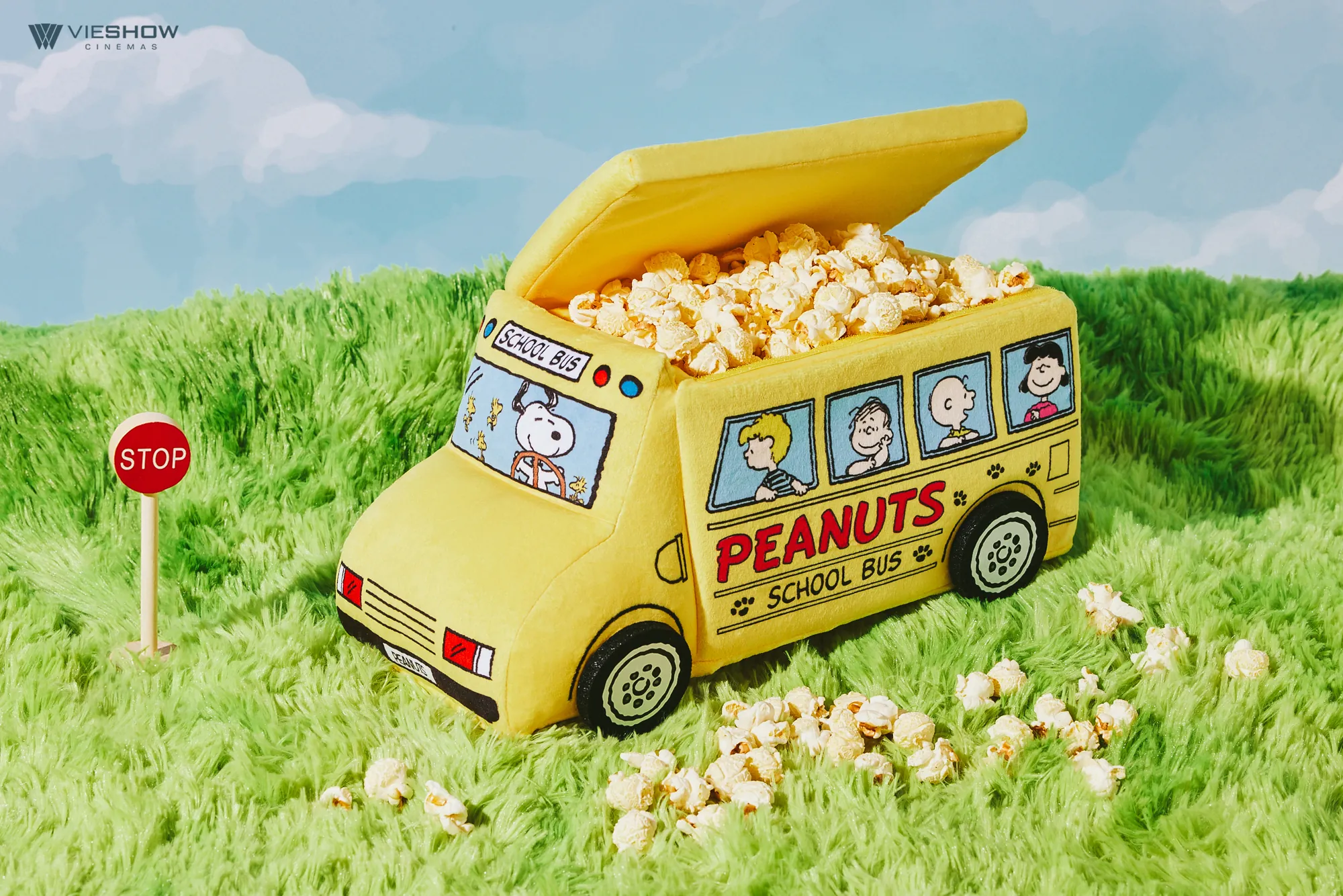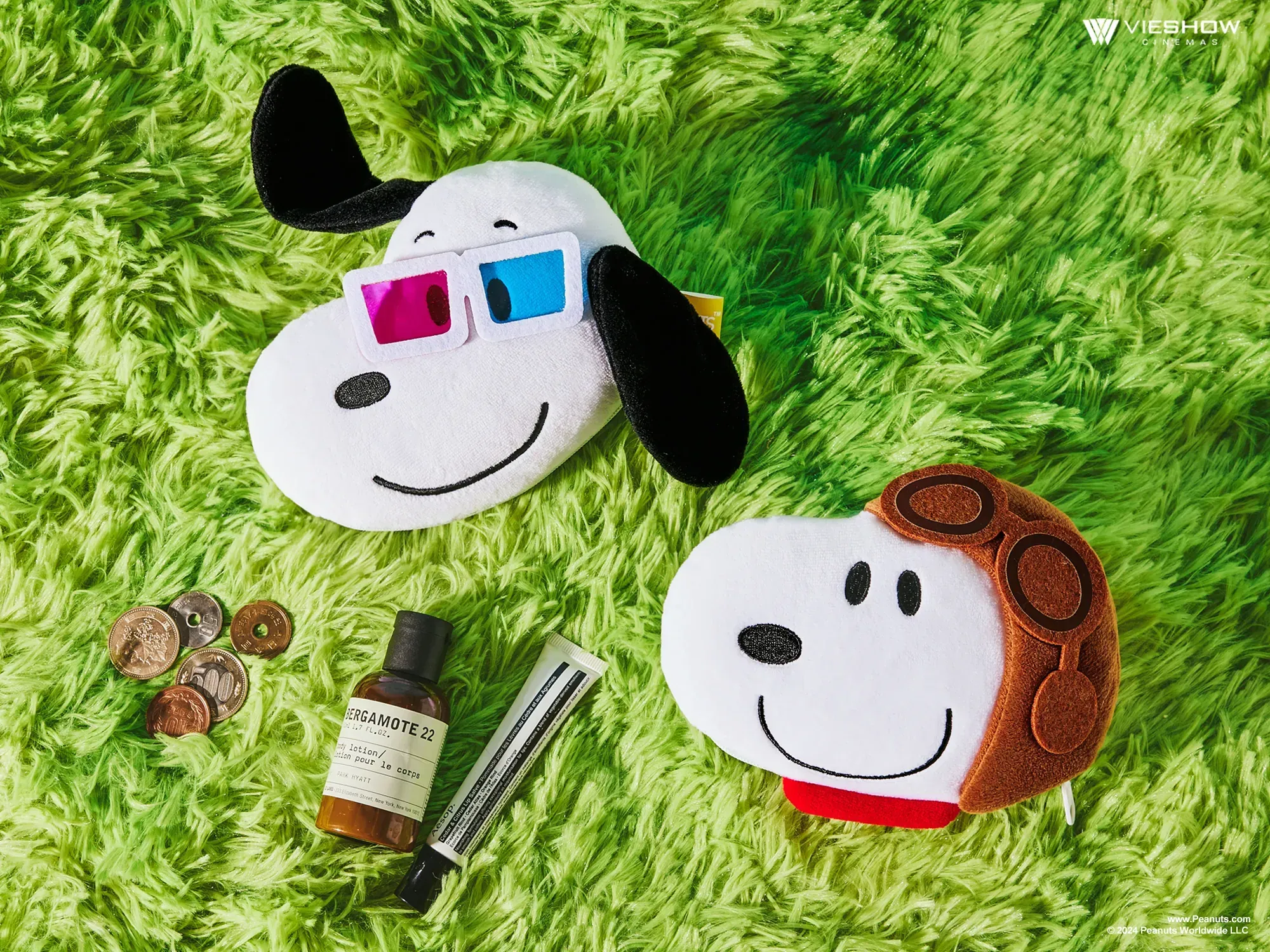 威秀影城 Snoopy 聯名系列商品,涵蓋玩偶收納掛袋、造型花束、經典校車爆米花桶、造型按摩槌、絨毛杯套、造型零錢包等多款商品。