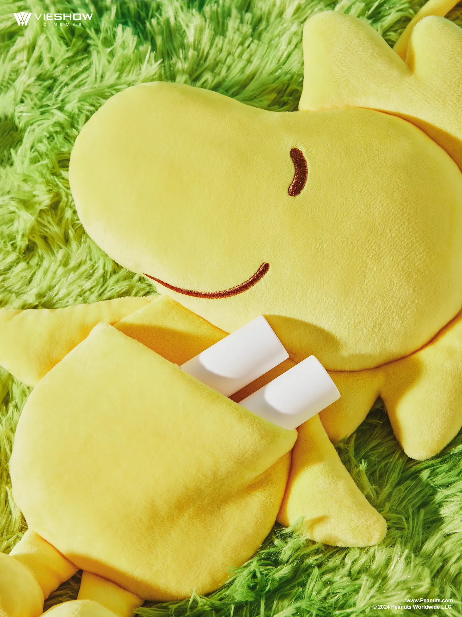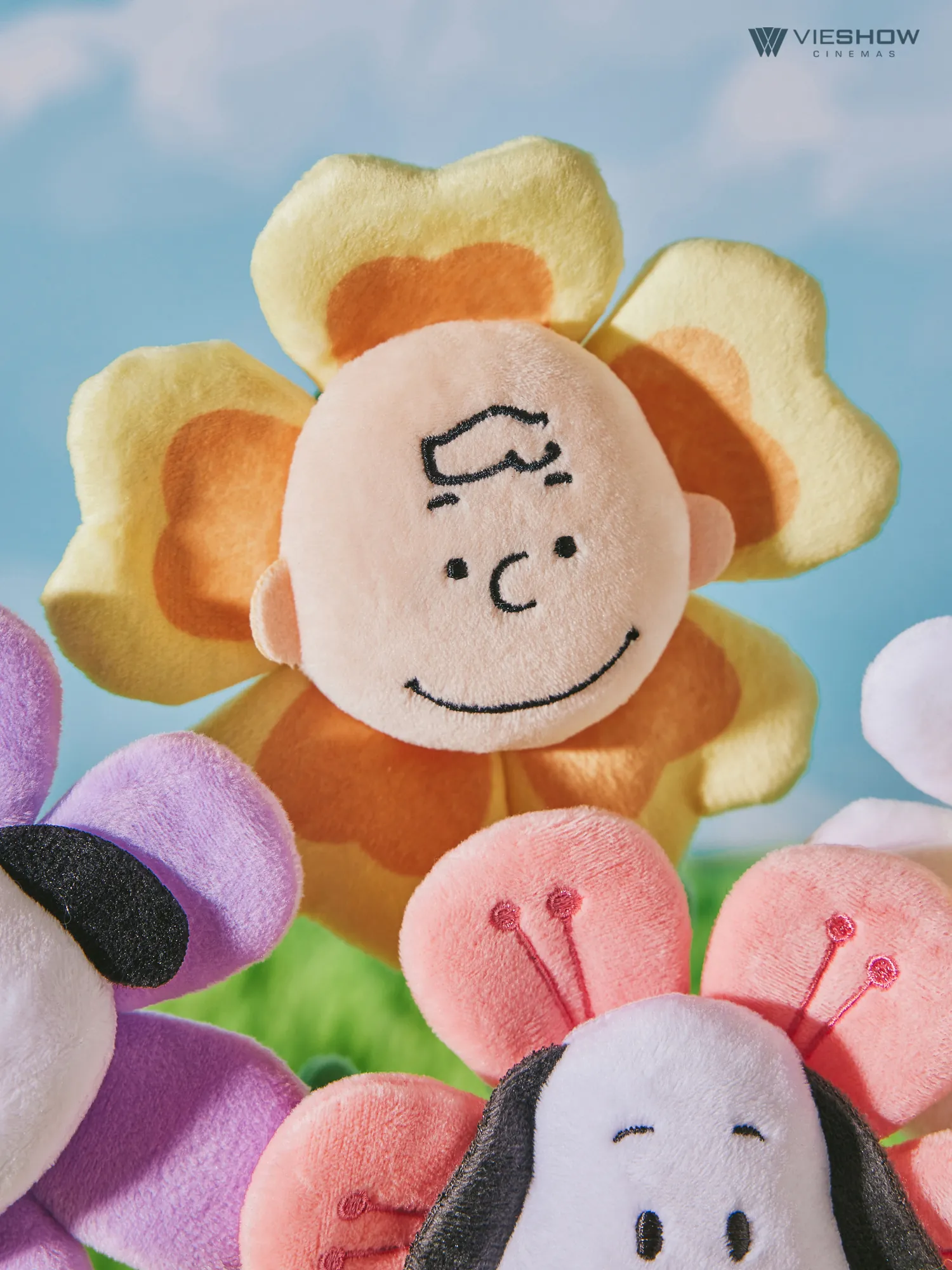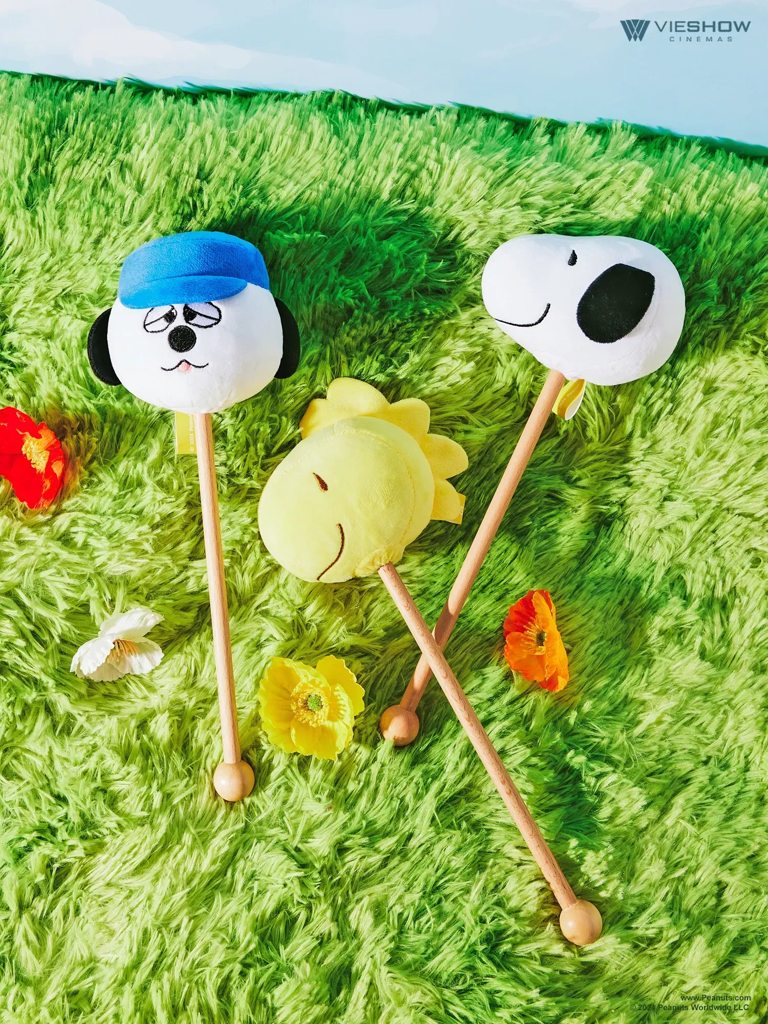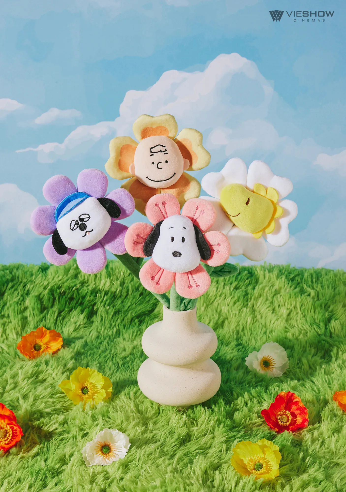 威秀影城 Snoopy 聯名系列商品,涵蓋玩偶收納掛袋、造型花束、經典校車爆米花桶、造型按摩槌、絨毛杯套、造型零錢包等多款商品。