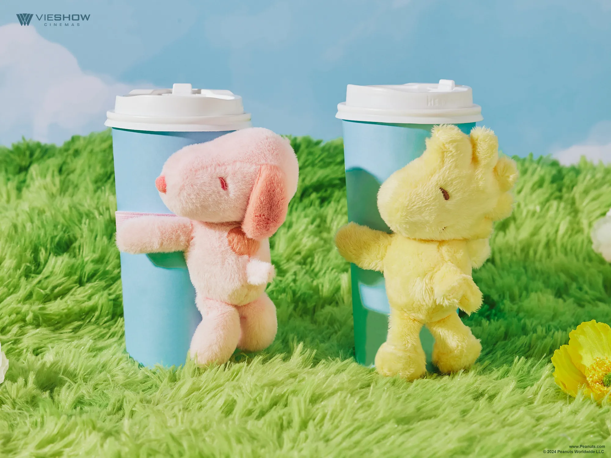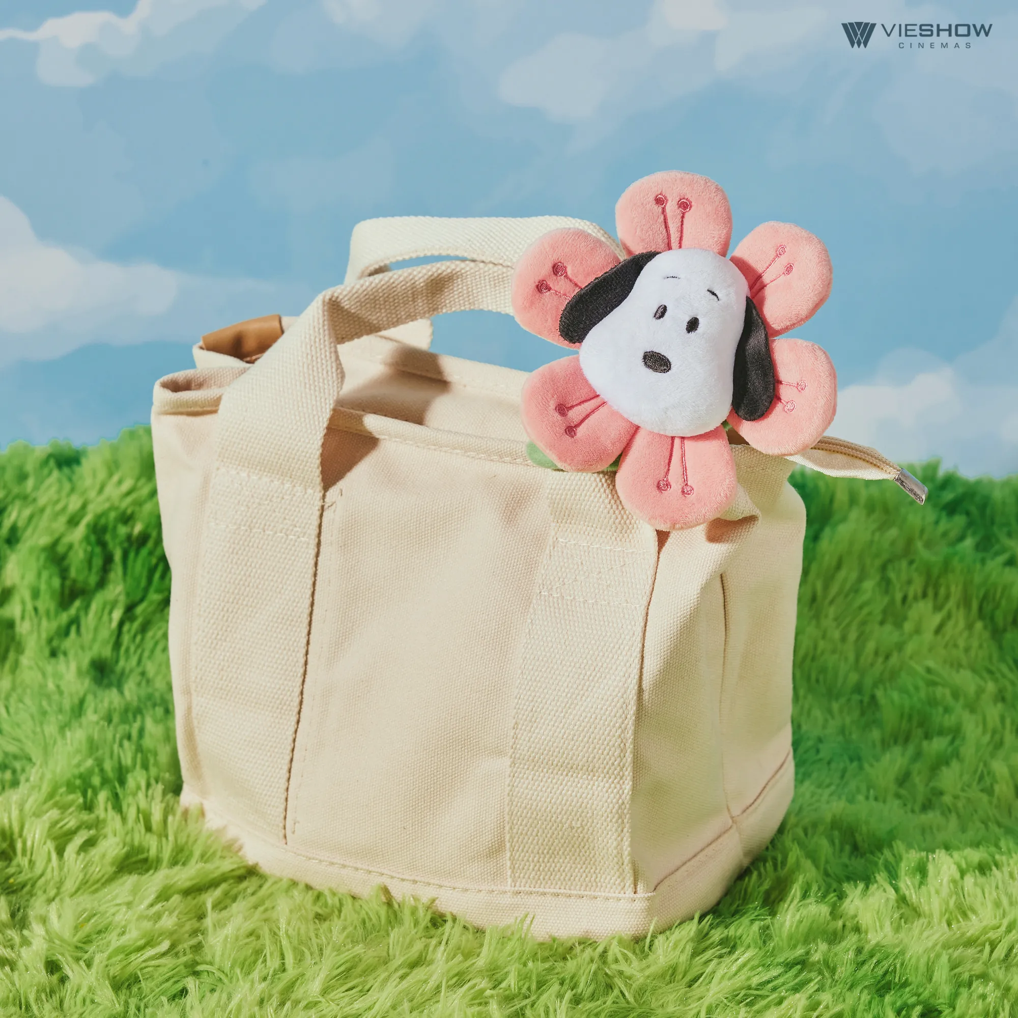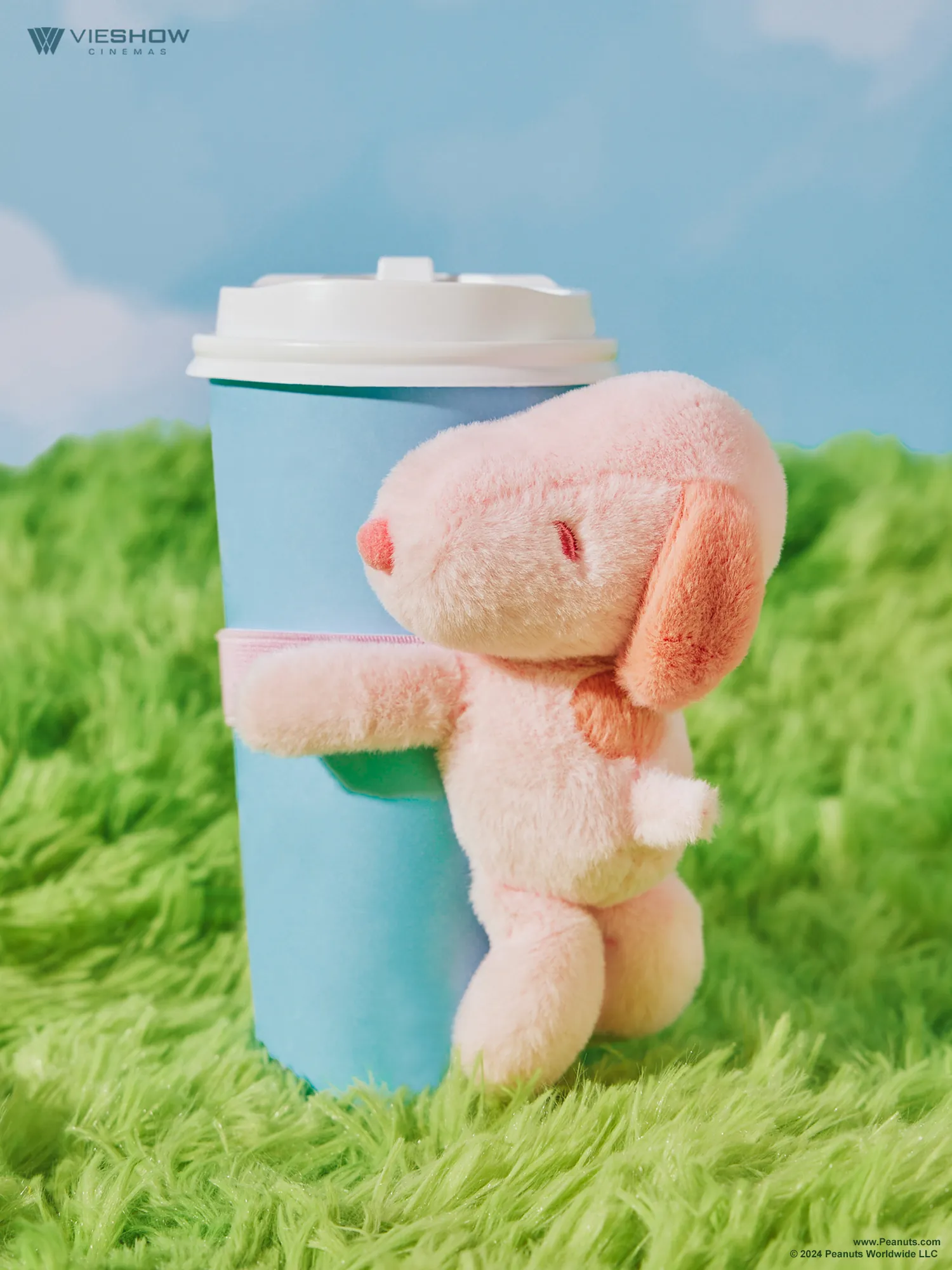 威秀影城 Snoopy 授權系列商品,包含玩偶收納掛袋、造型花束、爆米花桶、杯套等